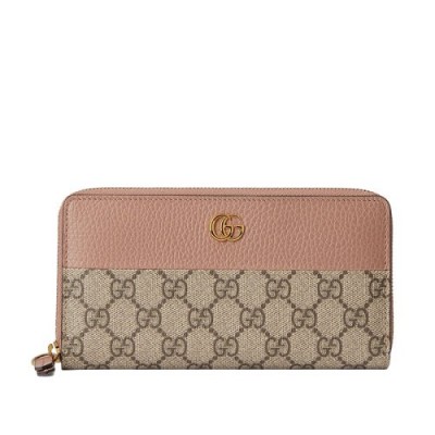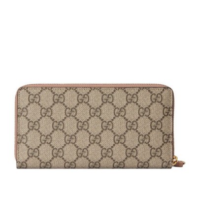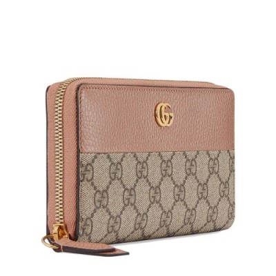GGMarmont系列推出这款采用GGSup*w*reme帆布和粉色皮革制成的全拉链式钱包。灵感源自70年代典藏设计的标志性双G造型配件令整体设计更添魅力。